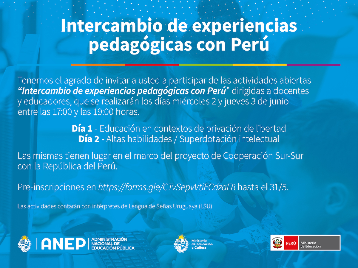 La Administración Nacional de Educación Pública (ANEP) convoca a participar de las actividades abiertas "Intercambio de experiencias pedagógicas con Perú", dirigidas a docentes y educadores, que se realizarán el miércoles 2 y jueves 3 de junio entre las 17:00 y las 19:00 horas.