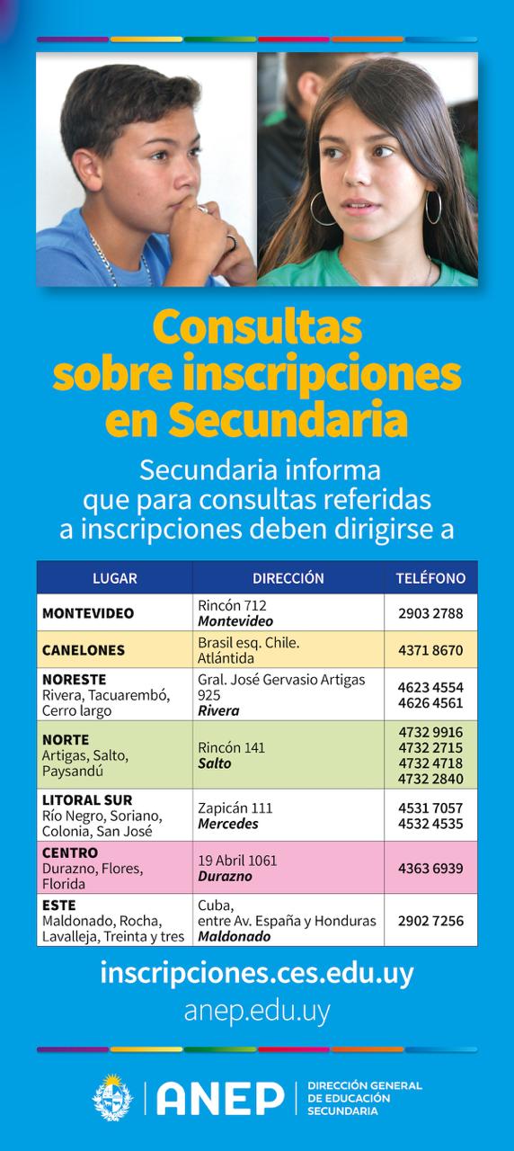 La Dirección General de Educación Secundaria (DGES) informa a las familias que por consultas referidas a las inscripciones en liceos de todo el país, podrán comunicarse a través de los siguientes teléfonos, dirigirse personalmente o realizar la consulta a través de la siguiente página web: Destino alumnos.