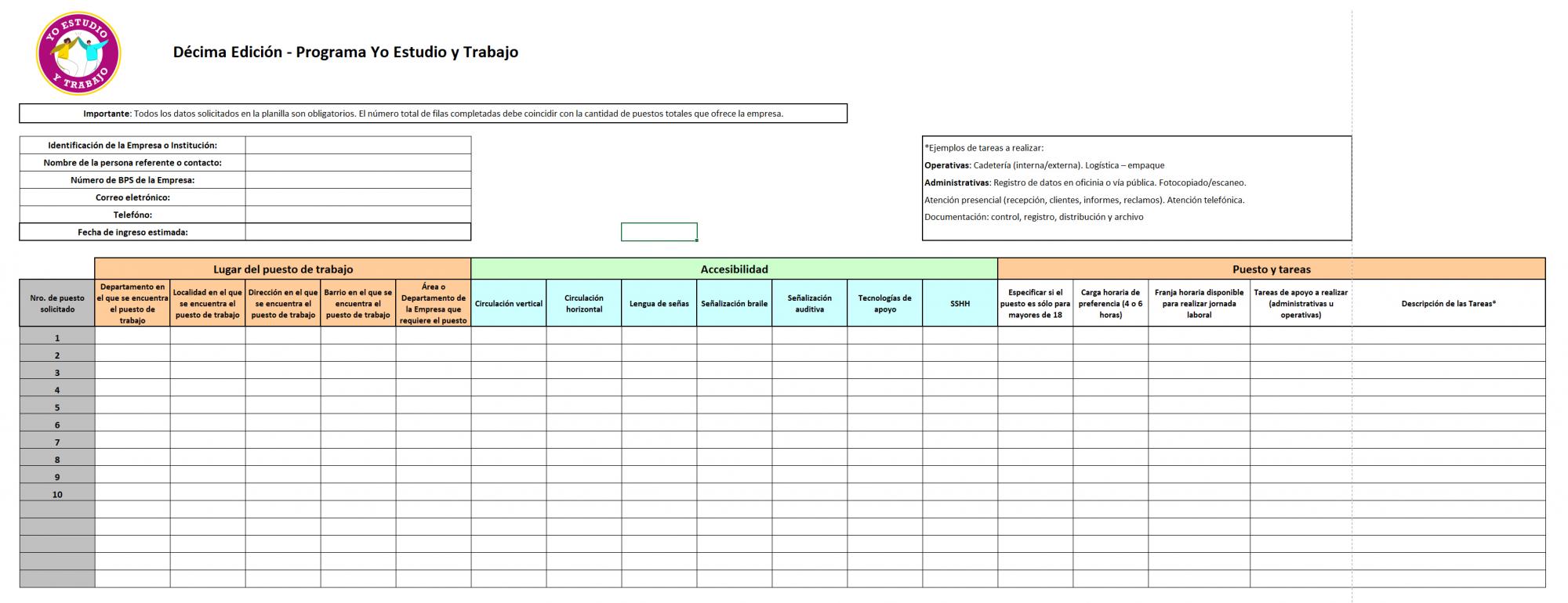 Las empresas que estén interesadas en contratar jóvenes a través del programa deberán enviar su adhesión hasta el 12 de noviembre a través de una nota, de acuerdo al siguiente detalle: debe estar dirigida al director nacional de Empleo del Ministerio de Trabajo y Seguridad Social, contener los datos que permitan la identificación de la empresa (nombre y número de BPS), expresar la adhesión a la décima edición del programa "Yo Estudio y Trabajo" y la aceptación de sus cláusulas, solicitar la cantidad de puestos requeridos especificando las localidades y contener la firma del responsable por la empresa.
